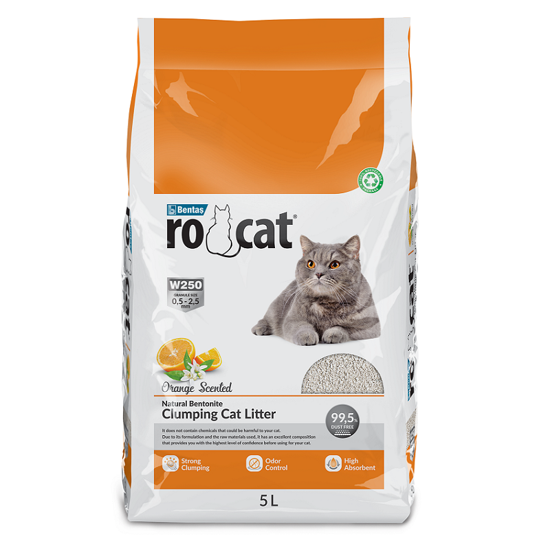 Наповнювач RoCat виготовляється з натурального білого бентоніту — природного глинистого мінералу, що пройшов подвійне просіювання для усунення пилу. Гранули середнього розміру (0.5–2.5 мм) швидко утворюють міцні грудочки (всього за 5 секунд), ефективно вбирають вологу та нейтралізують запахи. Завдяки натуральному складу наповнювач є безпечним навіть при випадковому потраплянні до організму тварини.