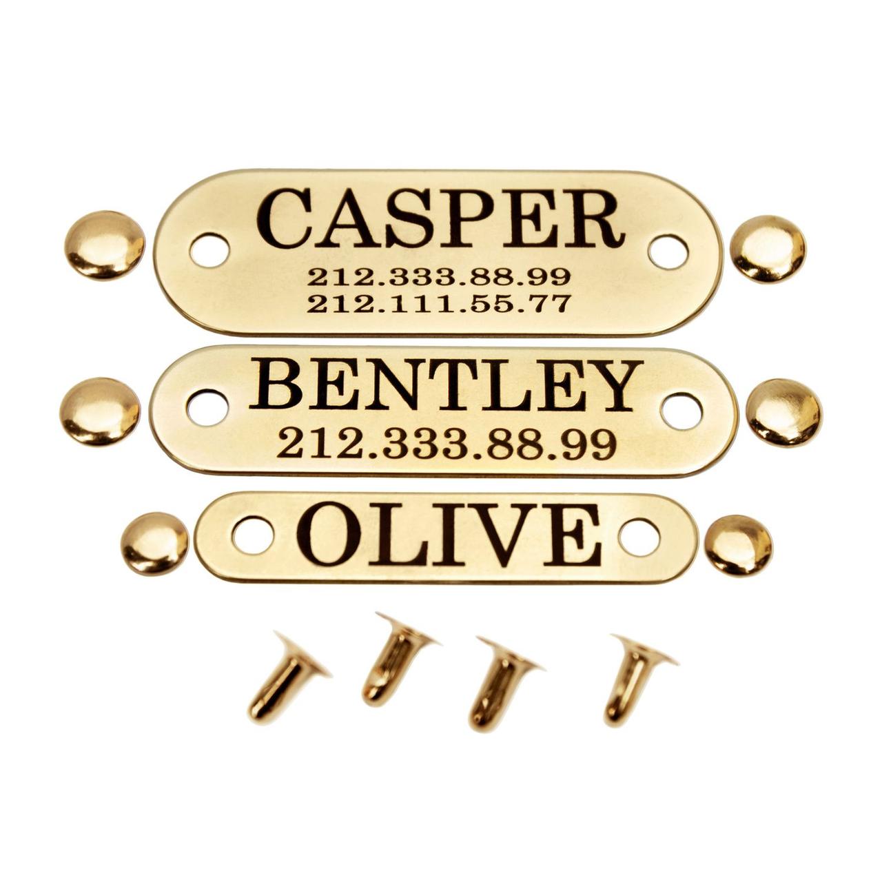 Ми пропонуємо адресники з латуні з позолоченим напиленням. Цей жетон доступний у трьох розмірах: S, M, L. Такий адресник можна закріпити на будь-якому нашийнику за допомогою заклепок, які йдуть в комплекті. Для нанесення гравіювання ми використовуємо високоточне лазерне обладнання, що дозволяє досягти якісного оформлення напису. Нанесений таким чином напис не затирається і не тьмяніє в процесі носіння. Щоб визначитися з розміром жетону, скористайтеся таблицею.